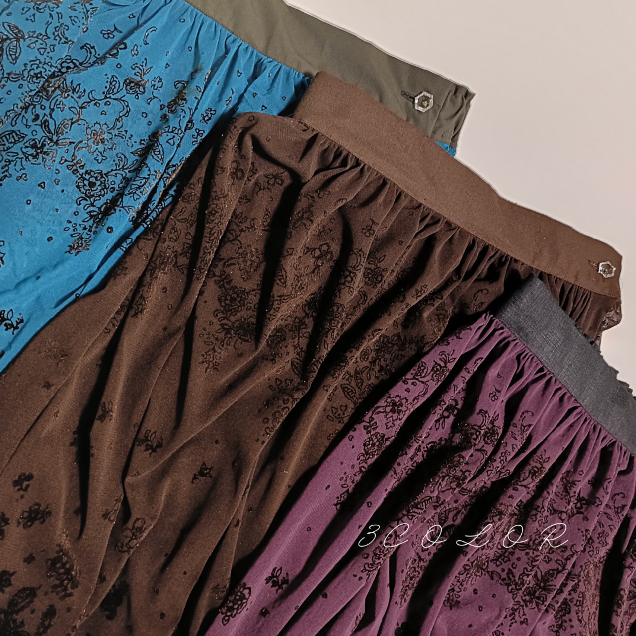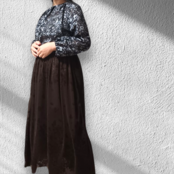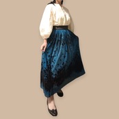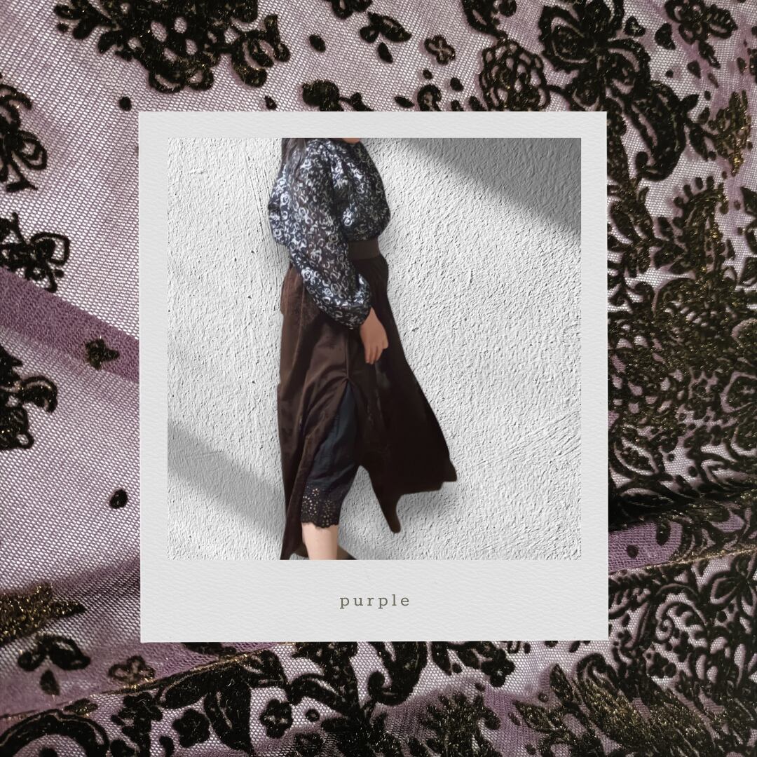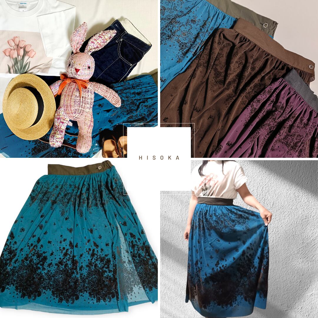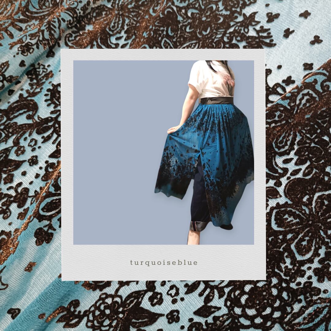 フロッキー柄のチュール生地を使用し、パネル使いで仕立てたこのオーバースカートは、見た目の美しさと着心地の良さを兼ね備えています。左側にはボタンホックが一つ付いており、ウエストフロントベルトと後ろのゴム仕様で、しっかりとしたフィット感を実現しています。鮮やかなタコイズブルー、エレガントなパープル、落ち着いたブラウン、シンプルなブラックの4色展開で、お好みに合わせてお選びいただけます。