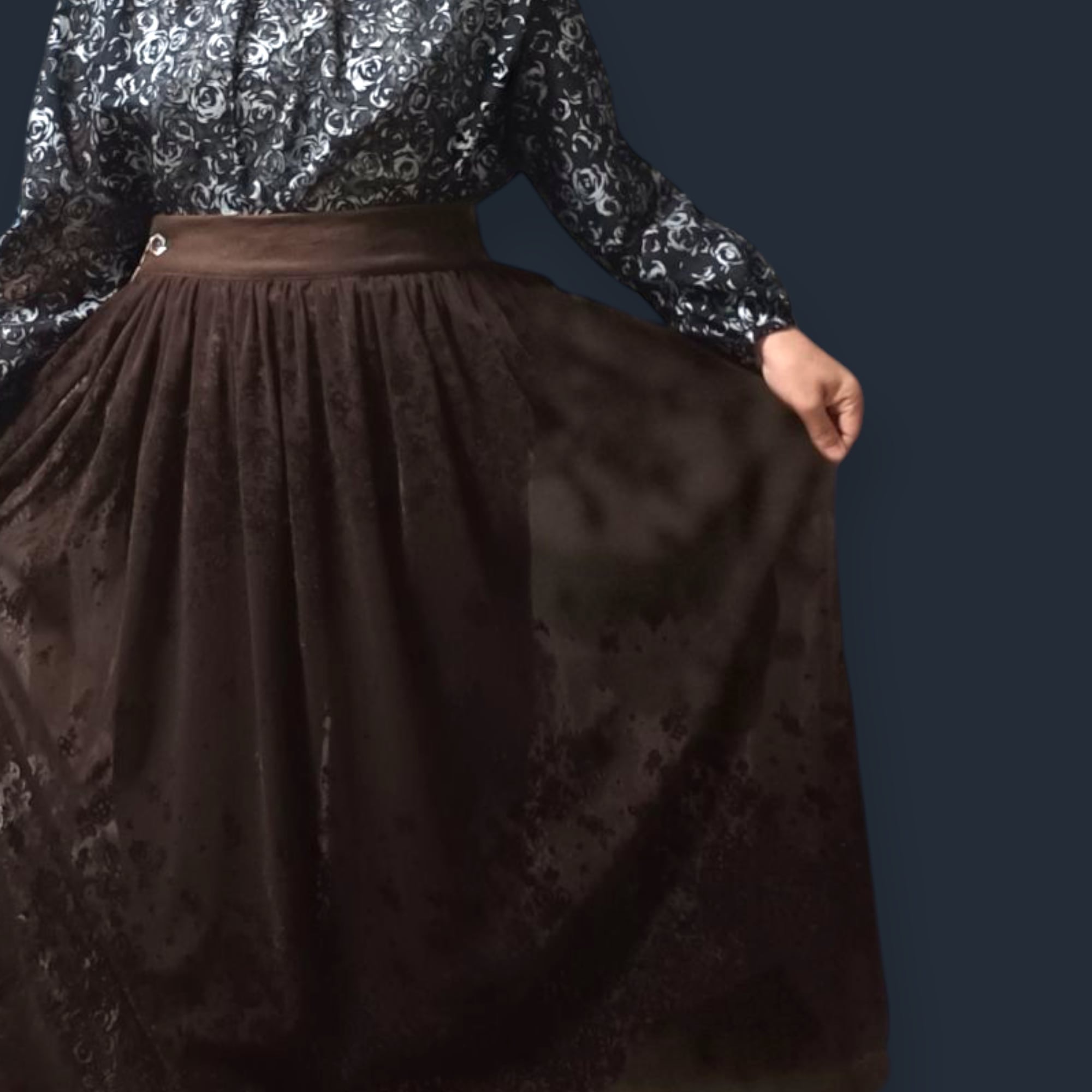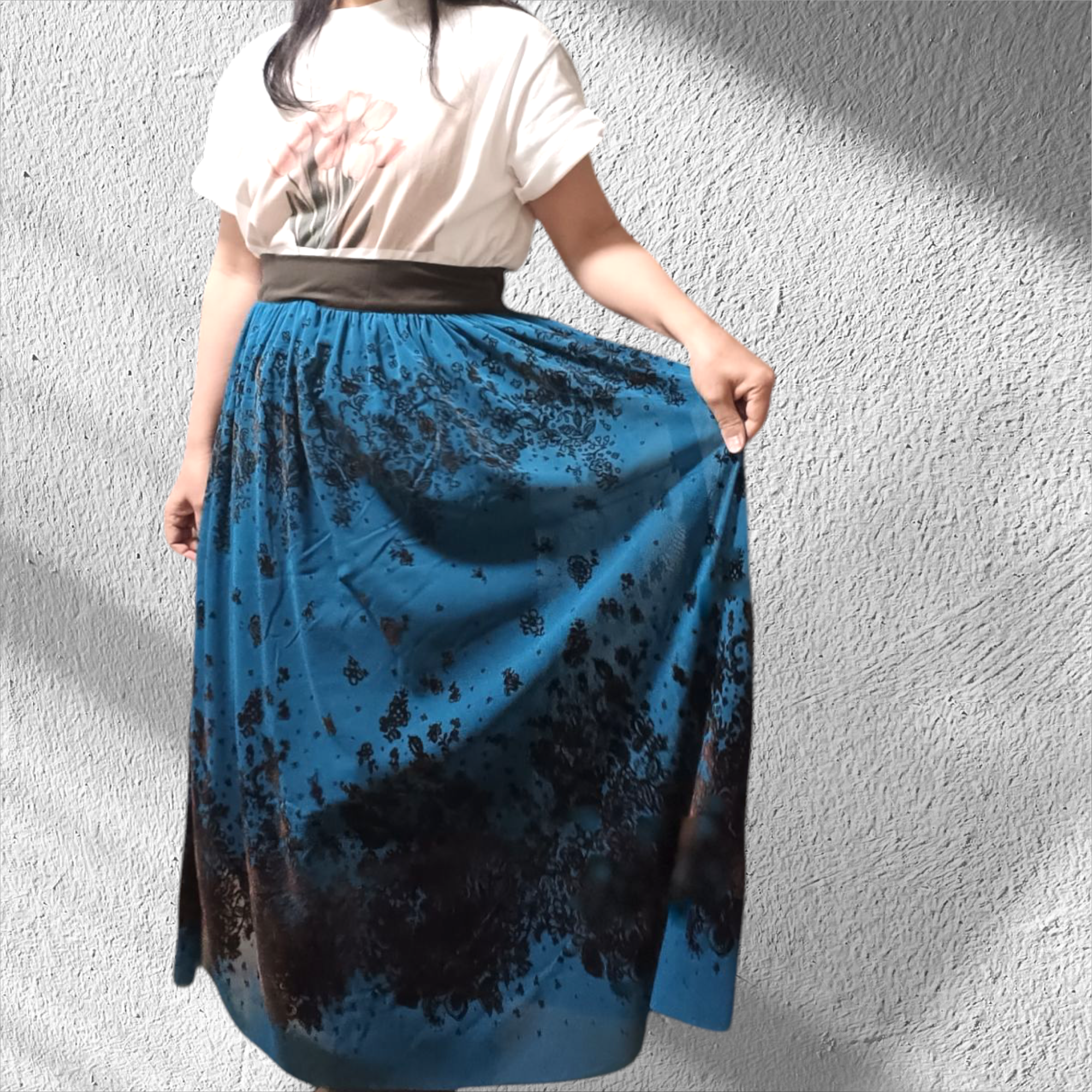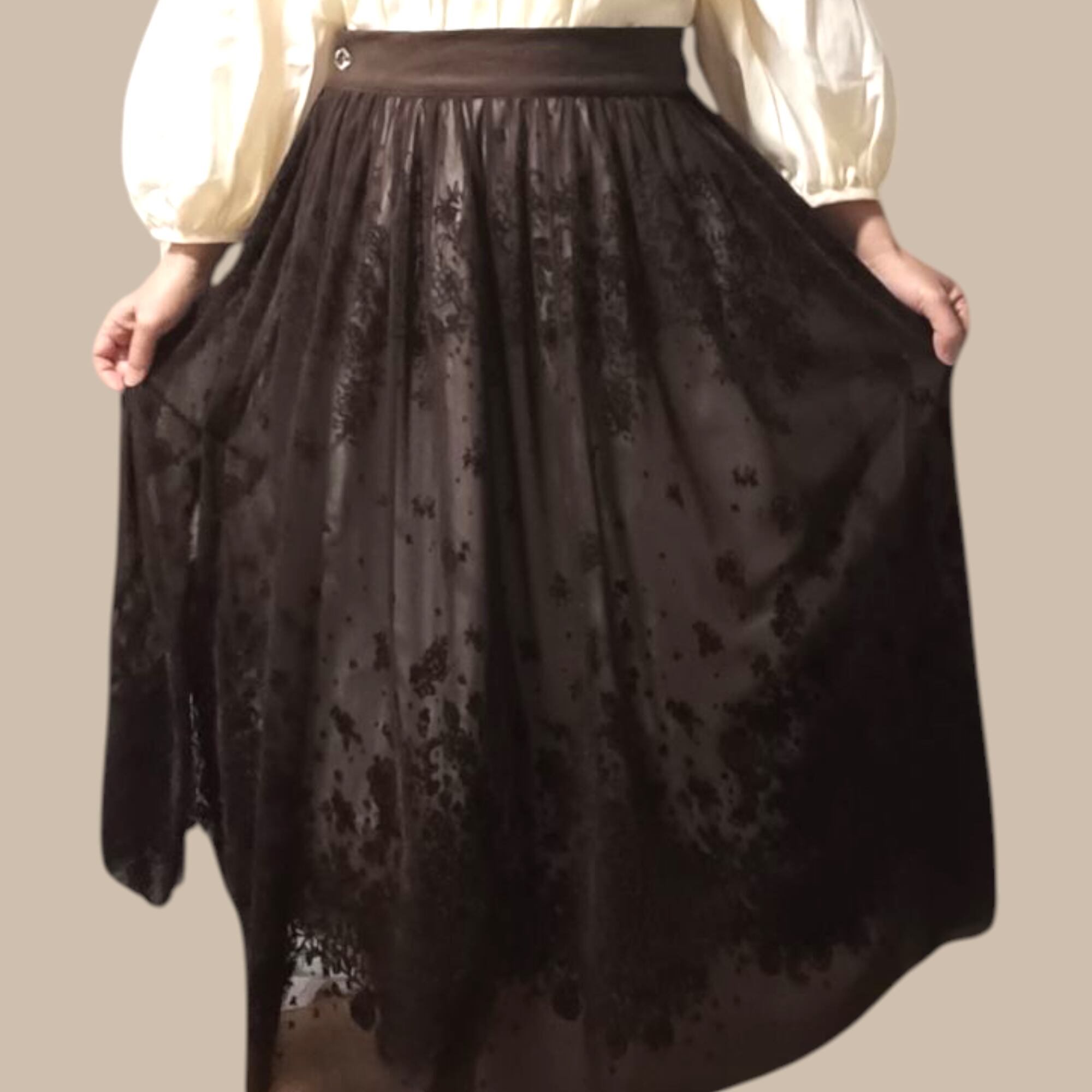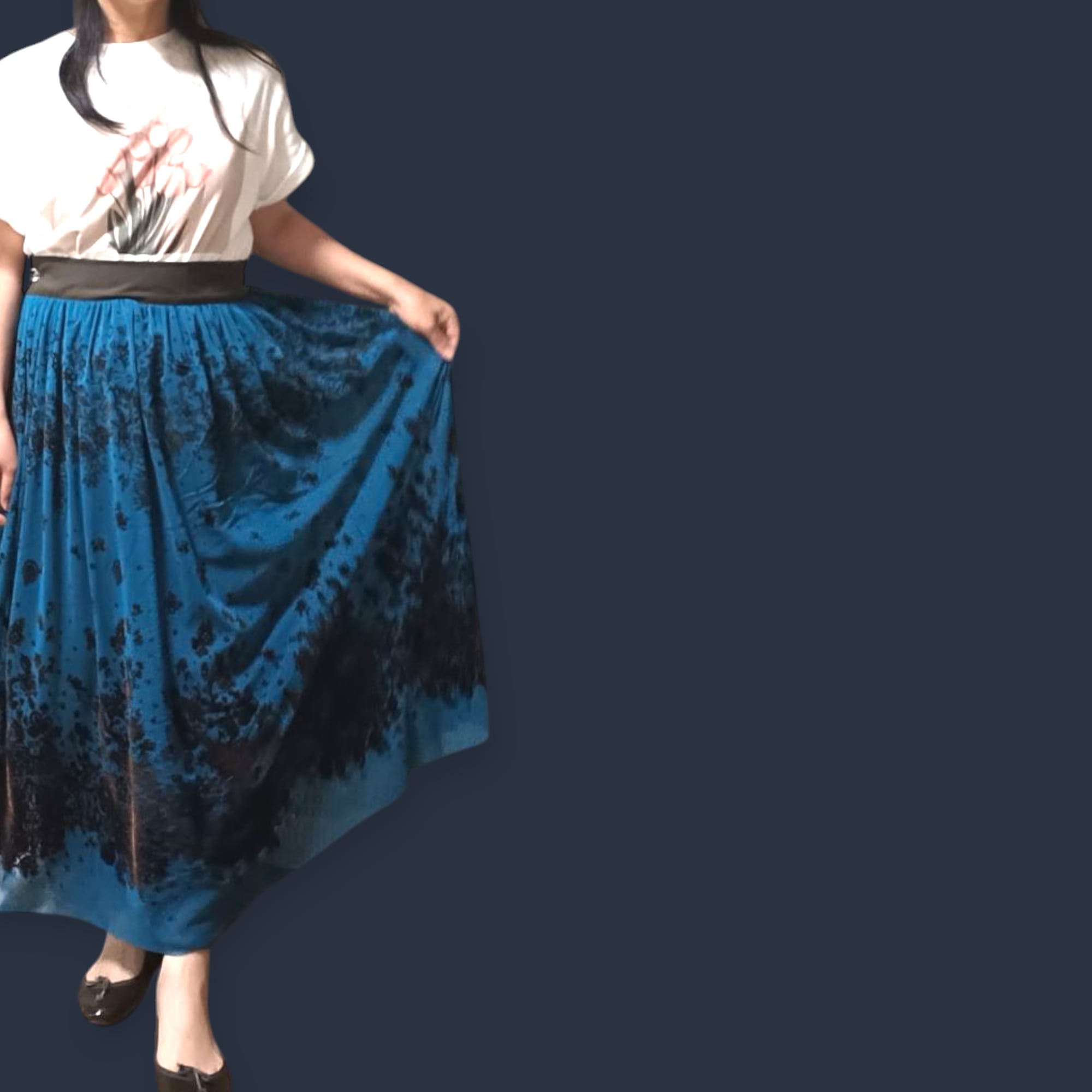 フロッキー柄のチュール生地を使用し、パネル使いで仕立てたこのオーバースカートは、見た目の美しさと着心地の良さを兼ね備えています。左側にはボタンホックが一つ付いており、ウエストフロントベルトと後ろのゴム仕様で、しっかりとしたフィット感を実現しています。鮮やかなタコイズブルー、エレガントなパープル、落ち着いたブラウン、シンプルなブラックの4色展開で、お好みに合わせてお選びいただけます。